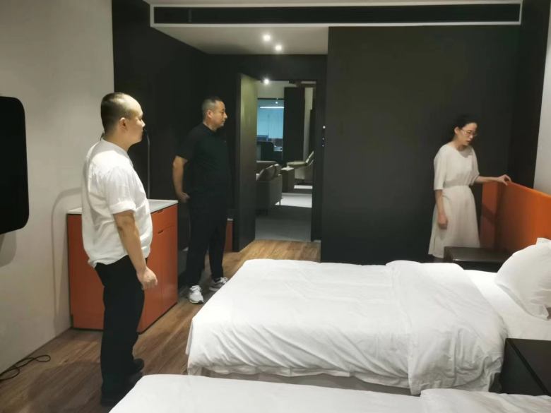 國慶假期期間,當(dāng)很多公司放假后人們都攜帶一家老小外出游玩的時(shí)候,來自商洛丹鳳縣的酒店客戶放棄休假時(shí)間專程來到西安酒店家具生產(chǎn)廠家排名前三的博菲克酒店家具工廠,在廠里等候已經(jīng)的博菲克總經(jīng)理?xiàng)钚怯H自熱情的接待。 這次過來之前,客戶順路先去了一趟我們博菲克九月份簽約的商洛某高端民宿工地現(xiàn)場,這里有我們已經(jīng)做好的酒店家具正在交貨安裝。對(duì)于酒店客戶而言,選擇酒店家具廠家無可厚非的三個(gè)重點(diǎn)就是品質(zhì)、價(jià)格和服務(wù)。當(dāng)他們?cè)谏搪迕袼揄?xiàng)目仔細(xì)端詳著每一件家具工藝的時(shí)候,熱情的甲方也迎上前來主動(dòng)扮演起了“推銷員”。“我們這個(gè)民