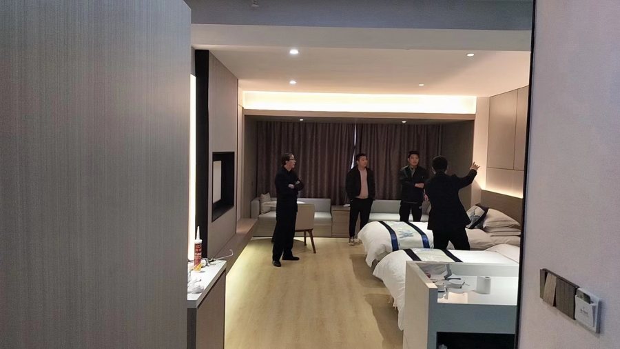 該項目的酒店客房委托西安博菲克集團管理有限公司所屬的設計部、裝修部、家具廠總包負責,設計部出客房效果圖,裝修部門抵達子洲縣進行施工,酒店家具廠根據效果圖制作家具,一站式服務,軟硬裝一方全包,無扯皮現象,客戶只等驗收。